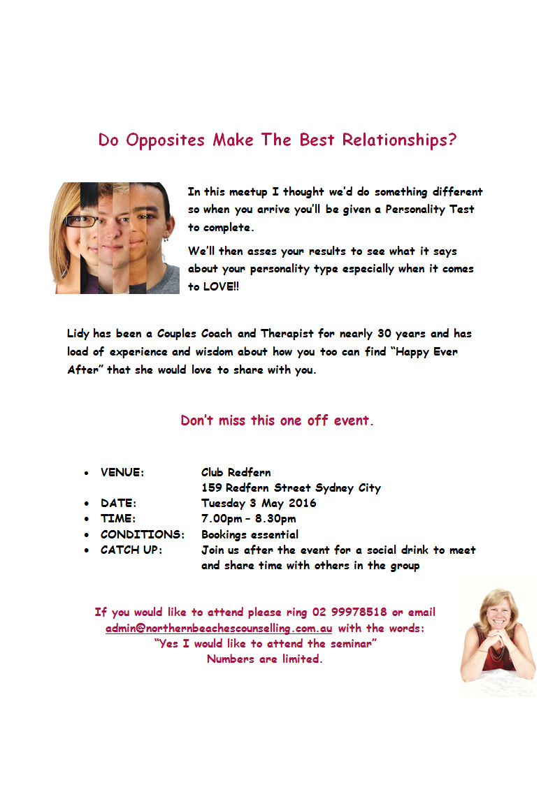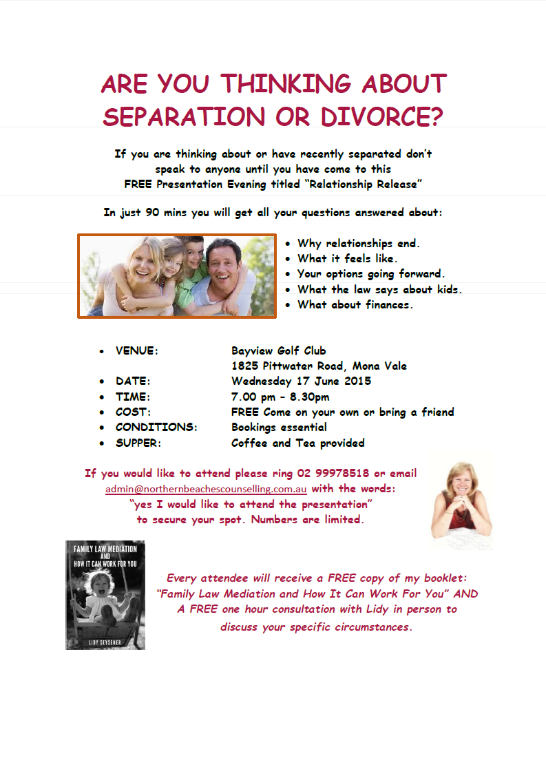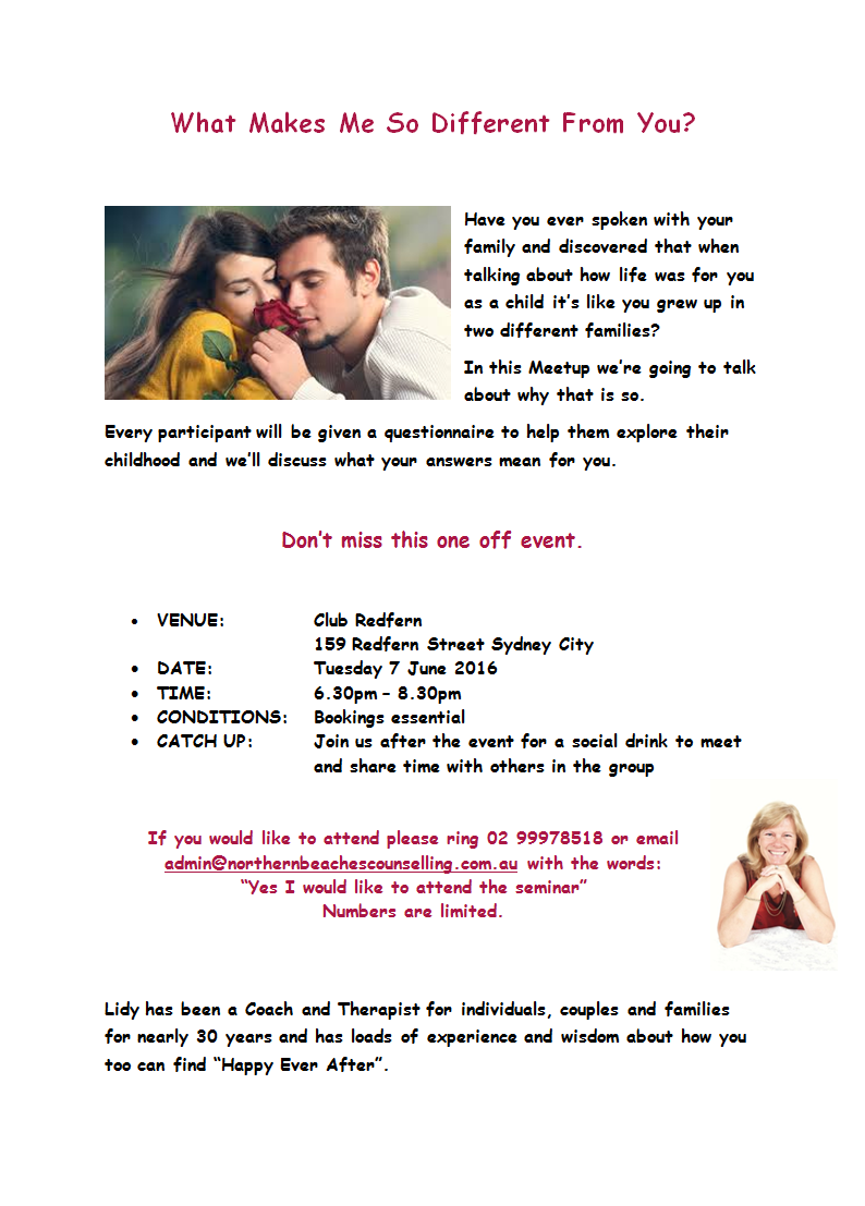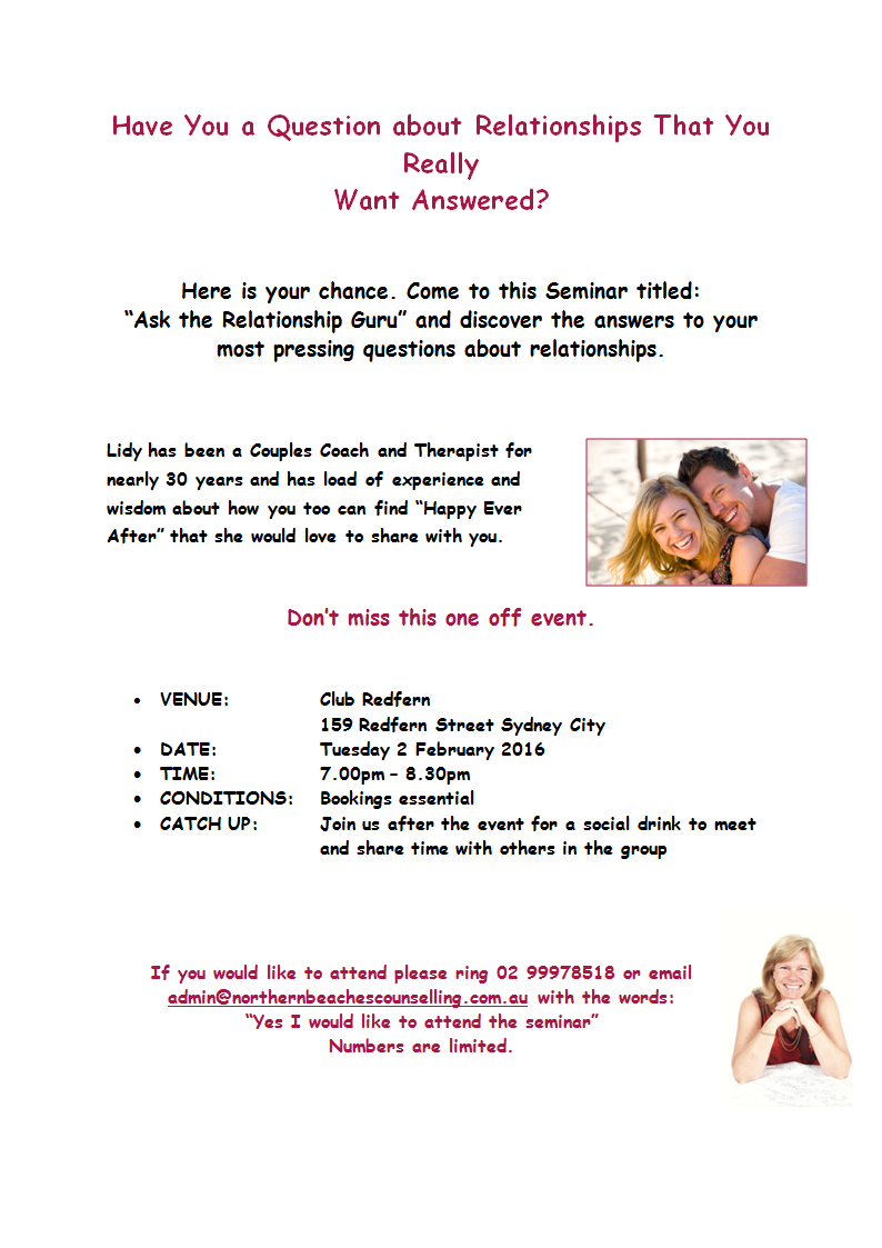 If you would like to attend the seminar please ring 02 99978518 or email admin@northernbeachescounselling.com.au with the words: “Yes I would like to attend the seminar”.