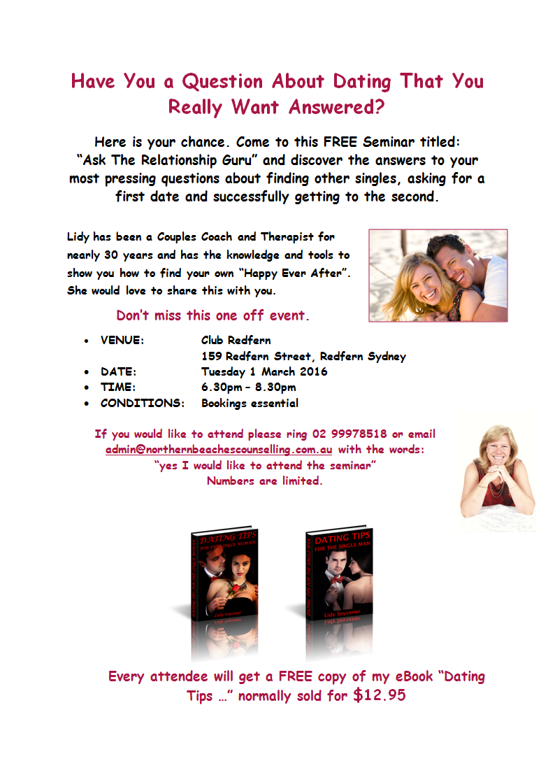 If you would like to attend this free seminar please ring 02 99978518 or email admin@northernbeachescounselling.com.au with the words: “Yes I would like to attend the seminar”.